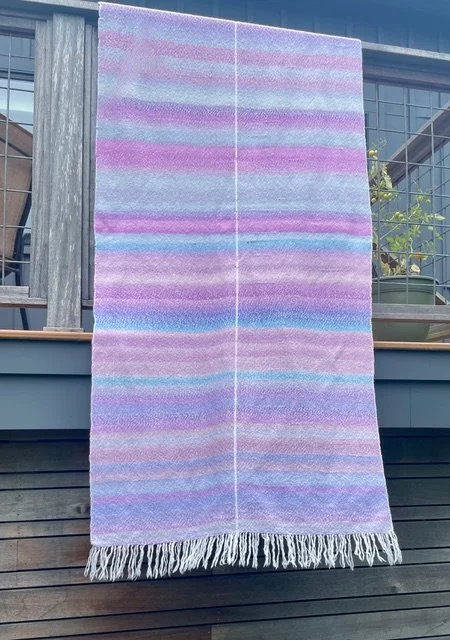 This piece is woven with Junction Fiber Mill 100% wool in colorway Hydrangea. It can be used for just about anything: a wrap on summer evenings, a splash of color on a bed, chair, or couch, a throw blanket, or a cushion cover. The perfect size and hue for summertime!