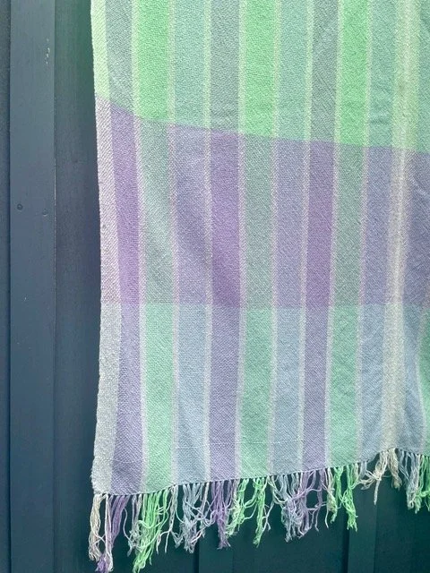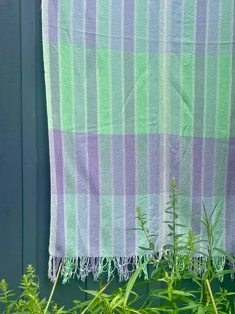 This piece is woven with 100% silk noil in summer hues of lilac purple and garden green. Use it on the bed, or couch, on the hammock or along on a boat ride, for extra warmth on a summer evening when the sun goes down, or a wrap for your shoulders over a sundress.