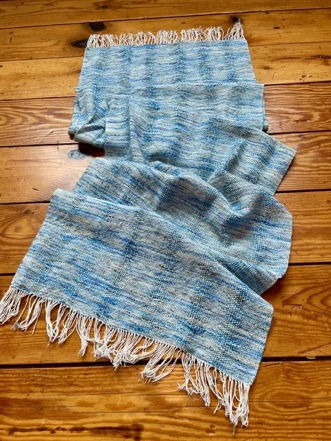 This piece is the perfect lightweight wrap, thrown over your shoulders or around your neck on a cool summer evening. It is woven with a silk noil warp and a hand-dyed merino wool and silk weft.