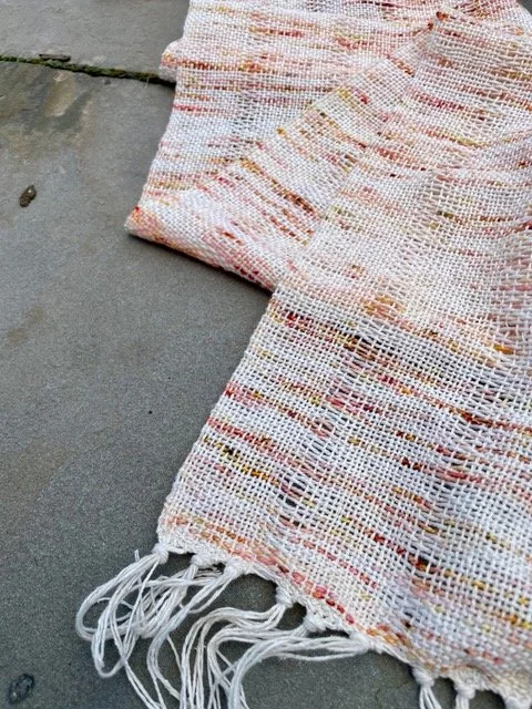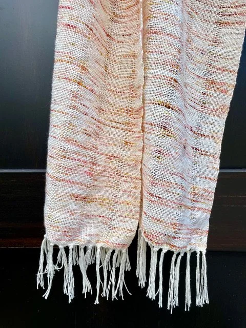 Wrap this lightweight scarf around your neck or toss it over your shoulders on a cool summer evening, or to dress up a casual summer outfit. This piece is woven with a silk noil warp and a hand-dyed merino wool weft.