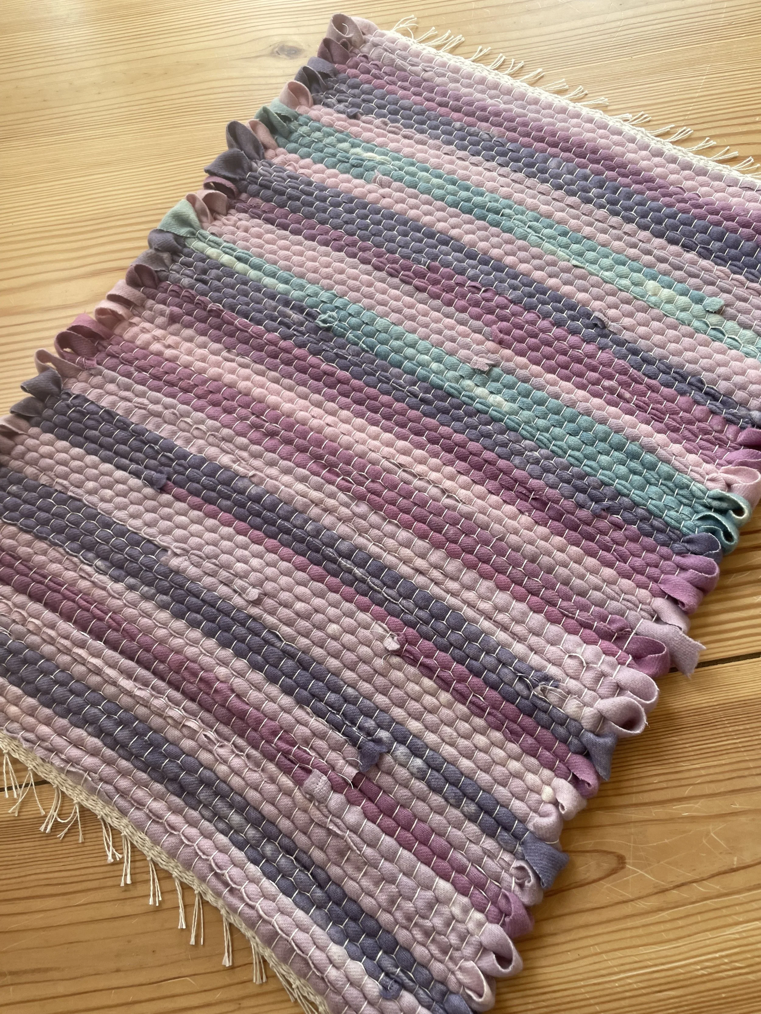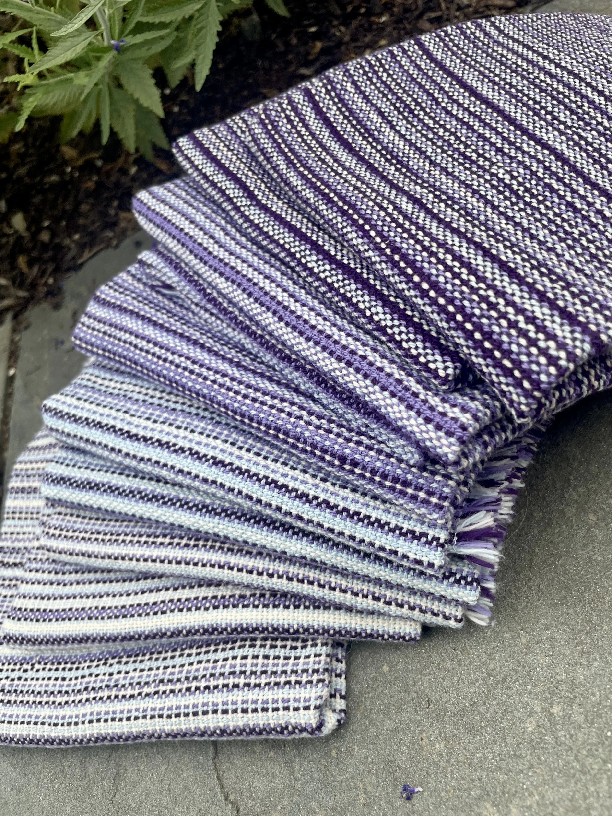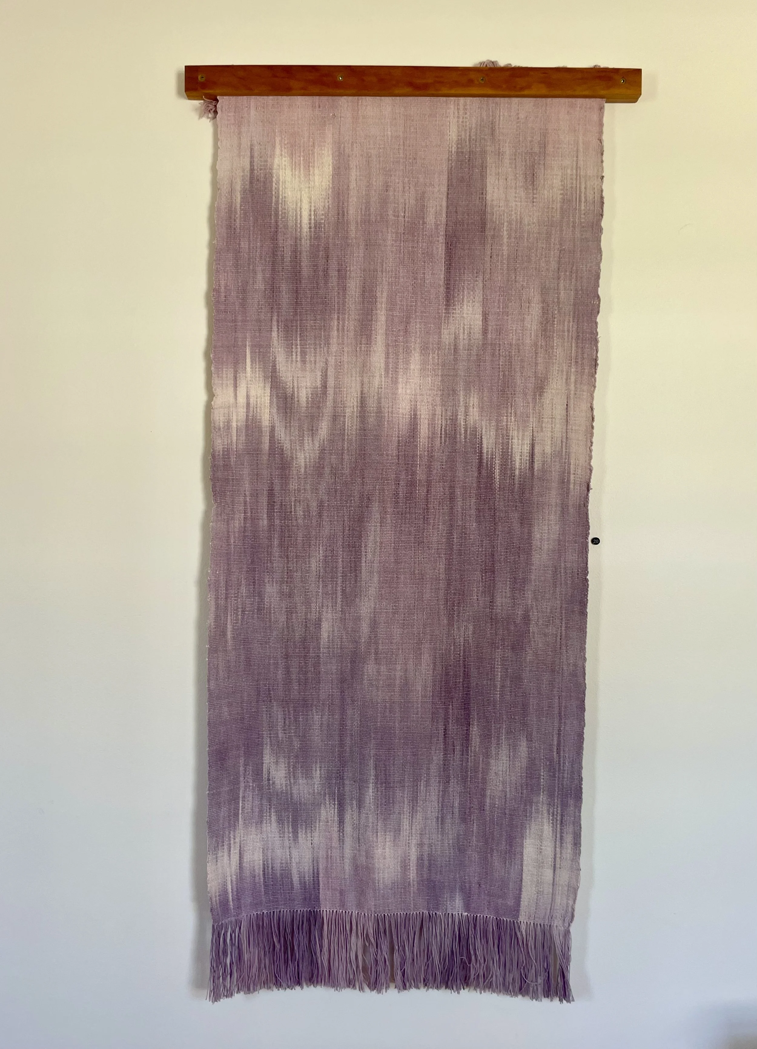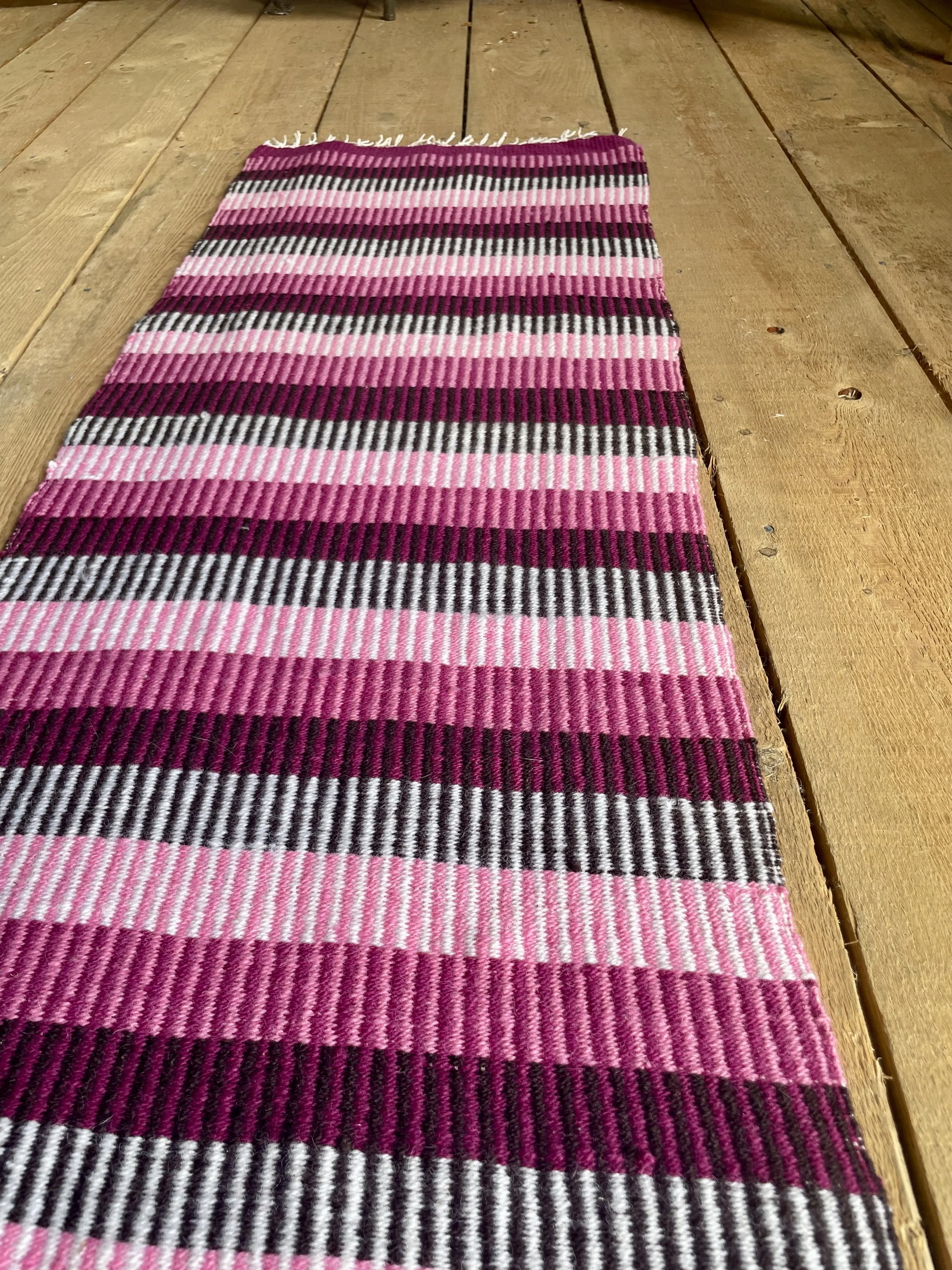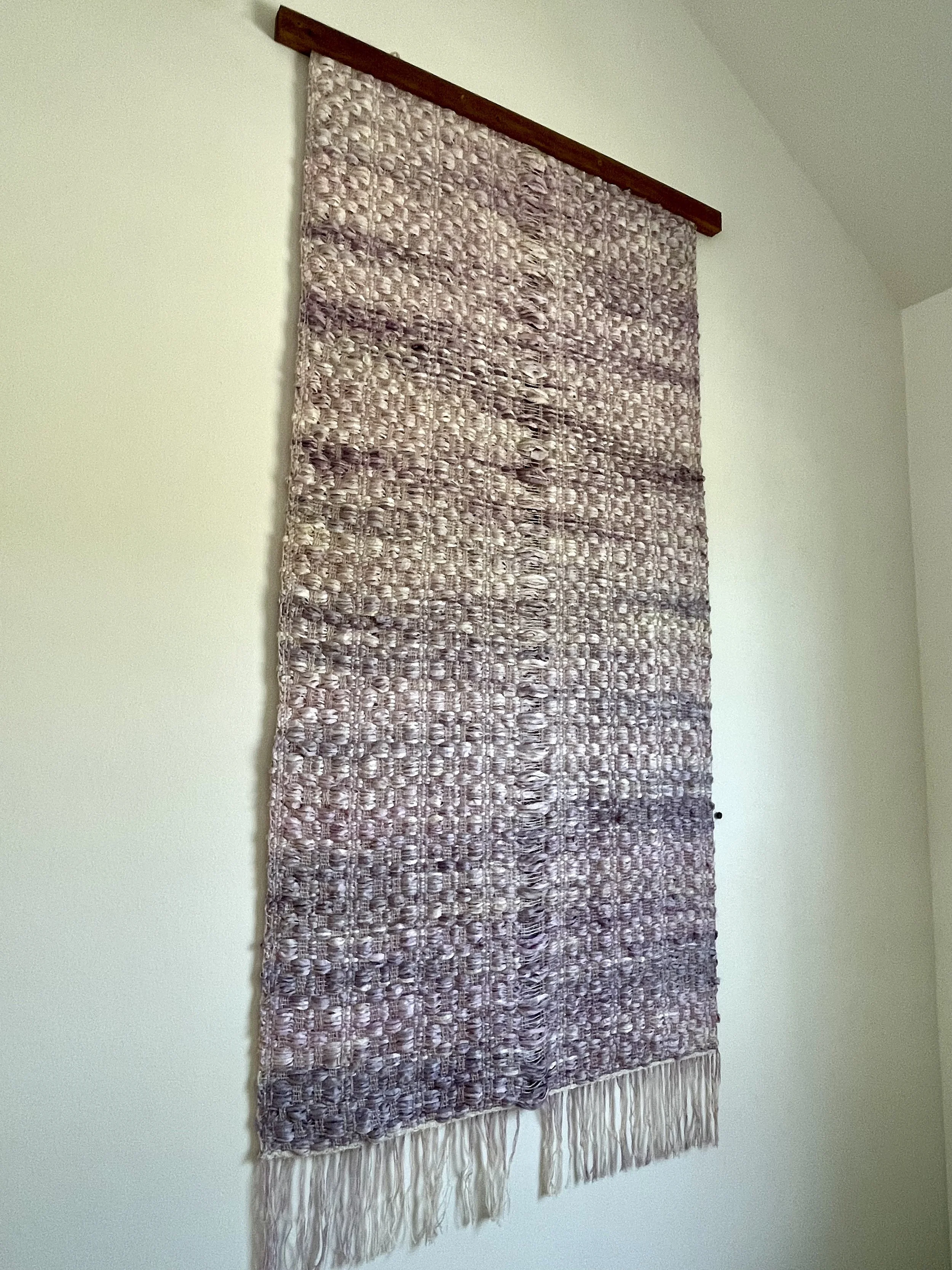 Botanically dyed sportweight wool in soft colors of lilac (warp) and pink (weft), woven in an 8-shaft drafat