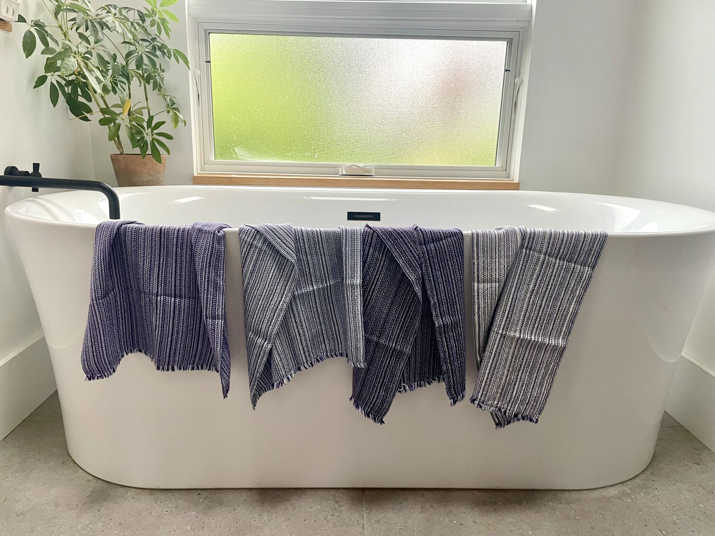 'I wove 4 picks of thicker scrap yarn between each towel, then after off the loom, sewed two rows of zigzag stitch on the ends of each towel, then cut apart in the middle of the scrap yarn. Machine washed cold, tumbled dry on delicate. I liked the short fringe, so I kept that instead of hemming the ends.