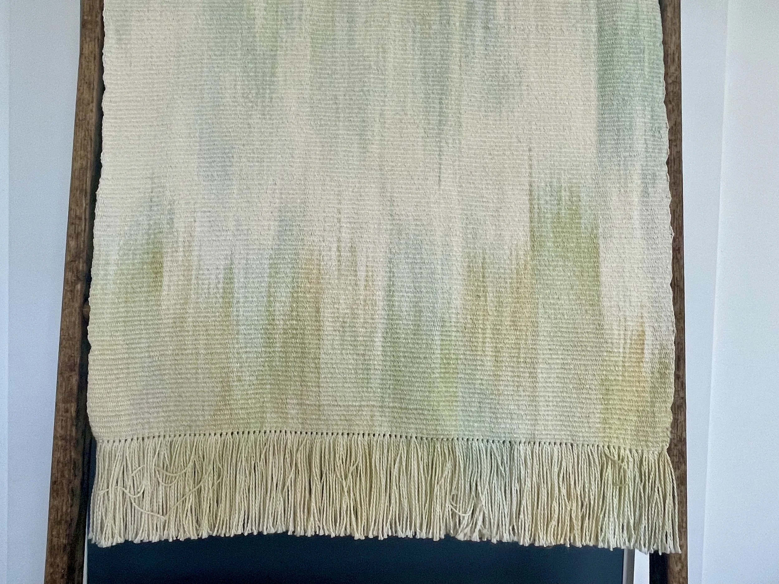 Weft: 3/2 cotton, hand painted with marigold and Saxon blue