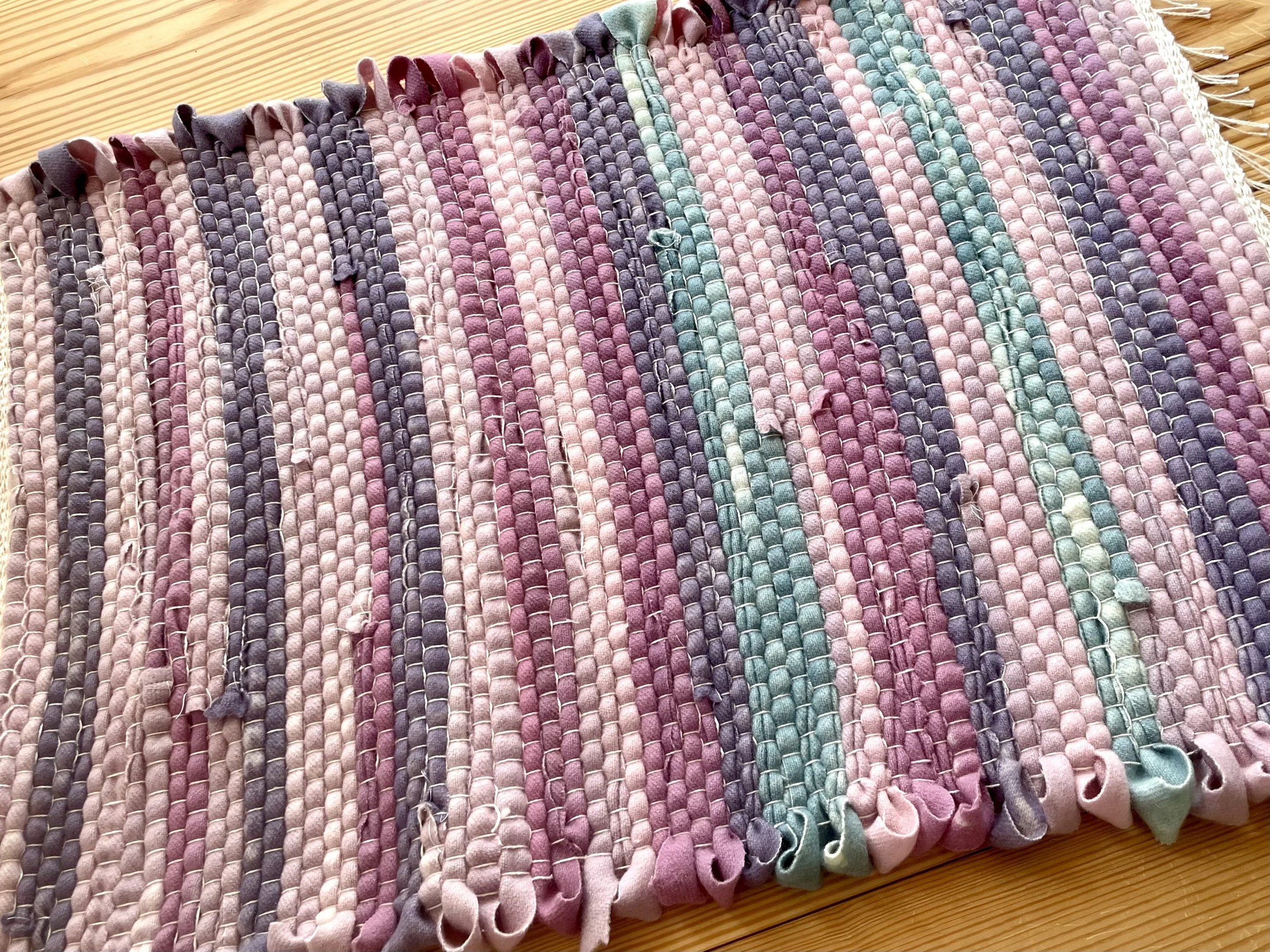 Weft: Wool felt, botanically dyed with weld, indigo, logwood, and cochineal, cut into 1” strips and sewed end to end